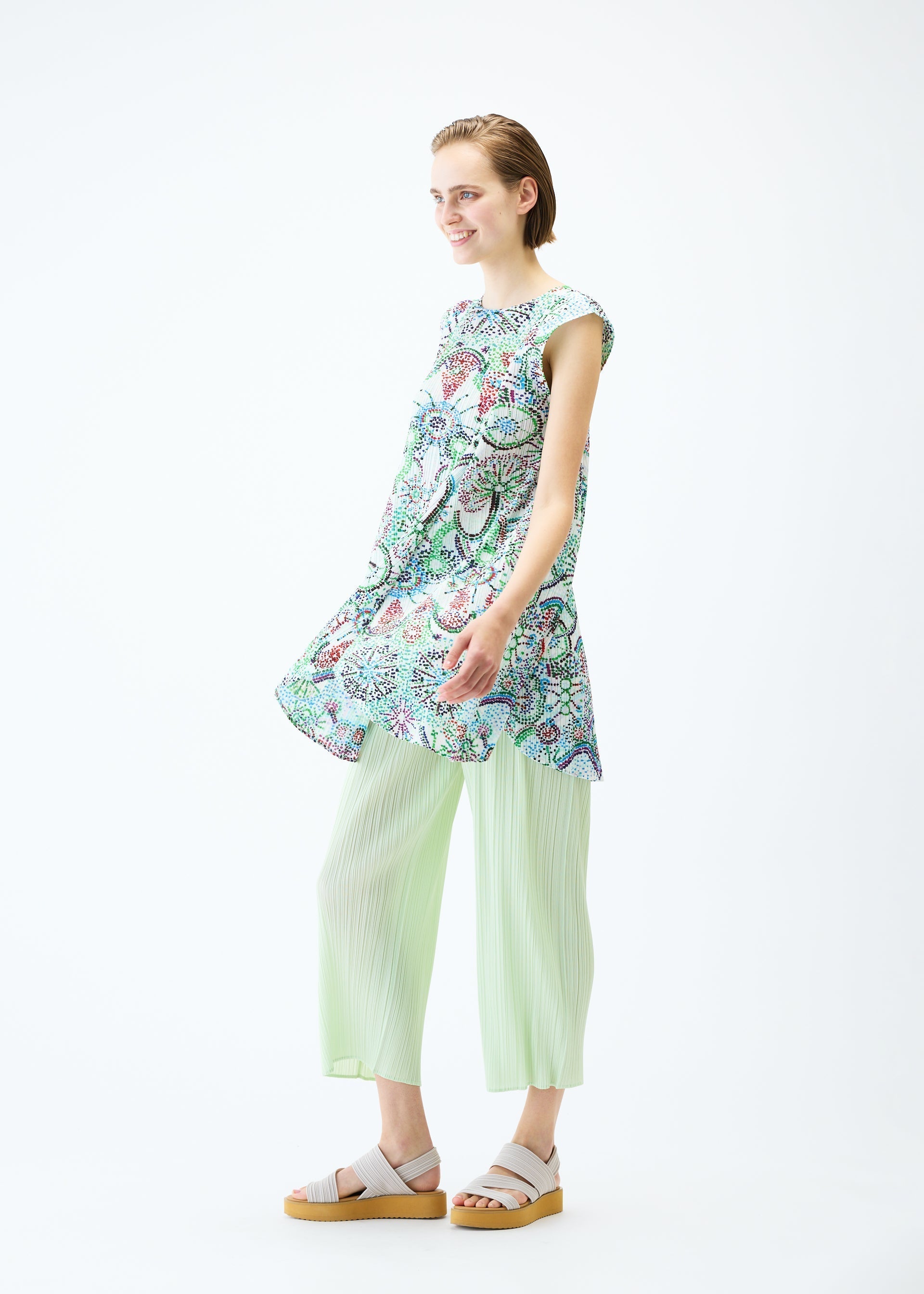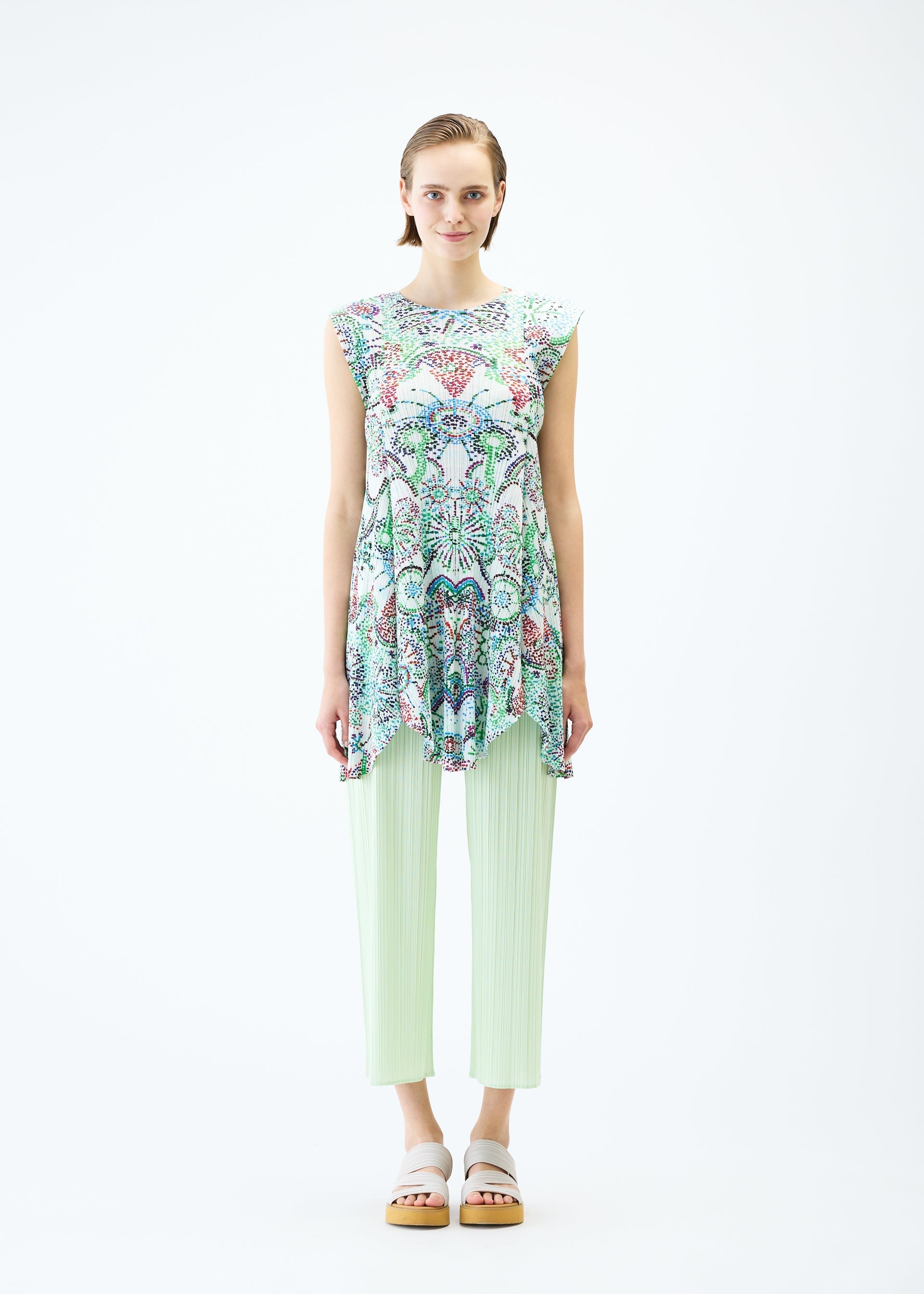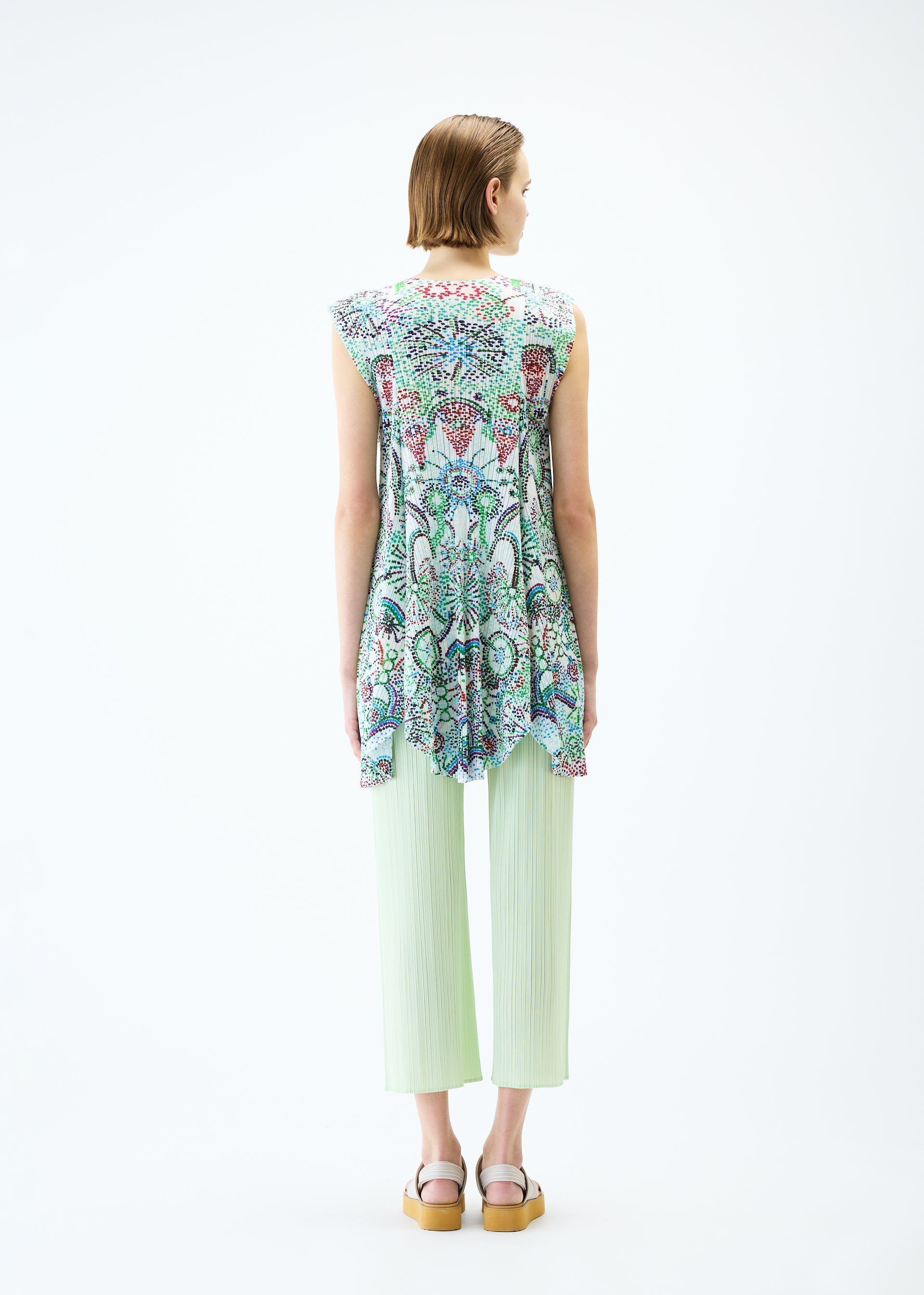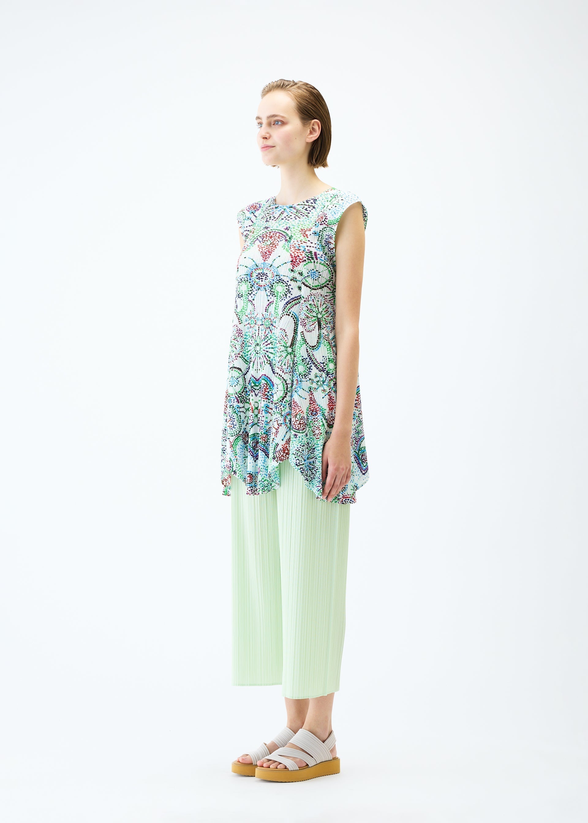 This round-neck, sleeveless tunic has a print featuring the motif of fireworks that evoke a sense of innocence and warmth. It depicts fireworks with dots that look like blurred ink.