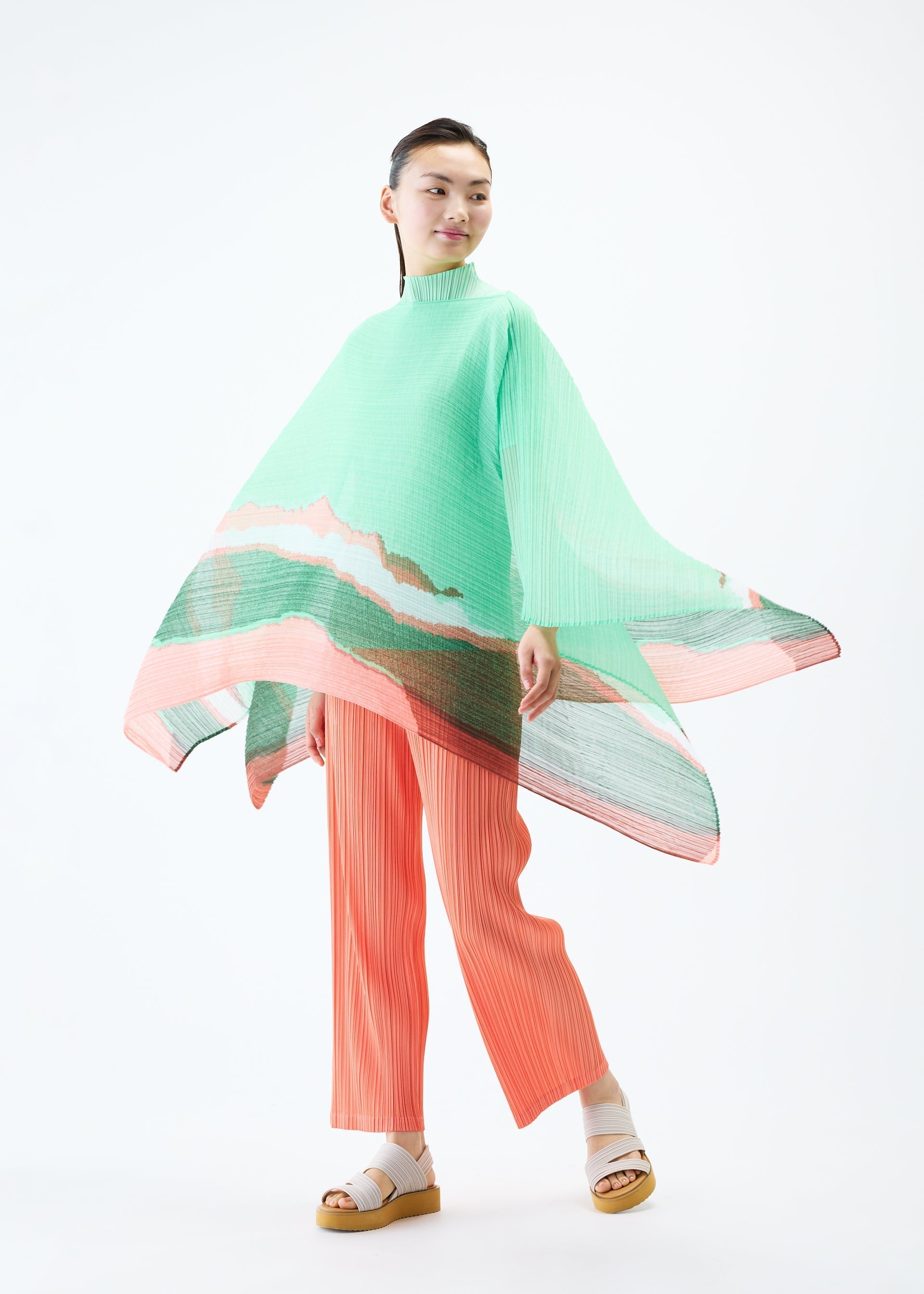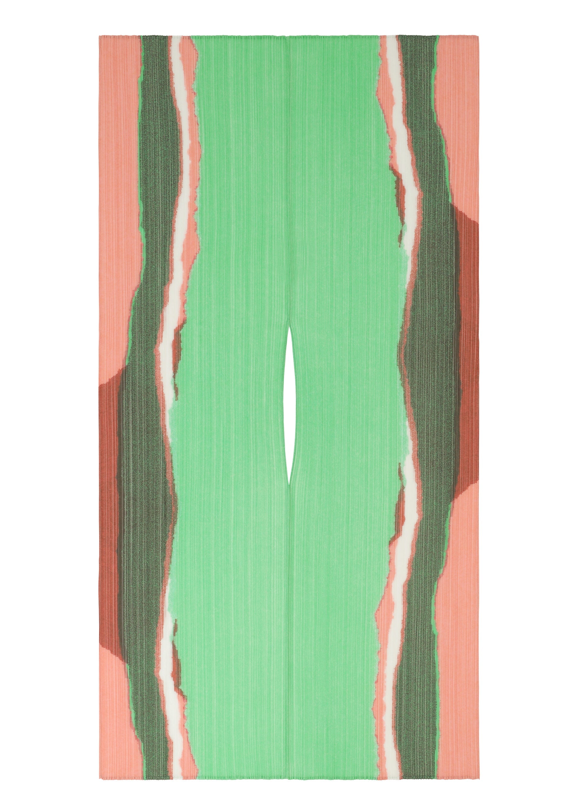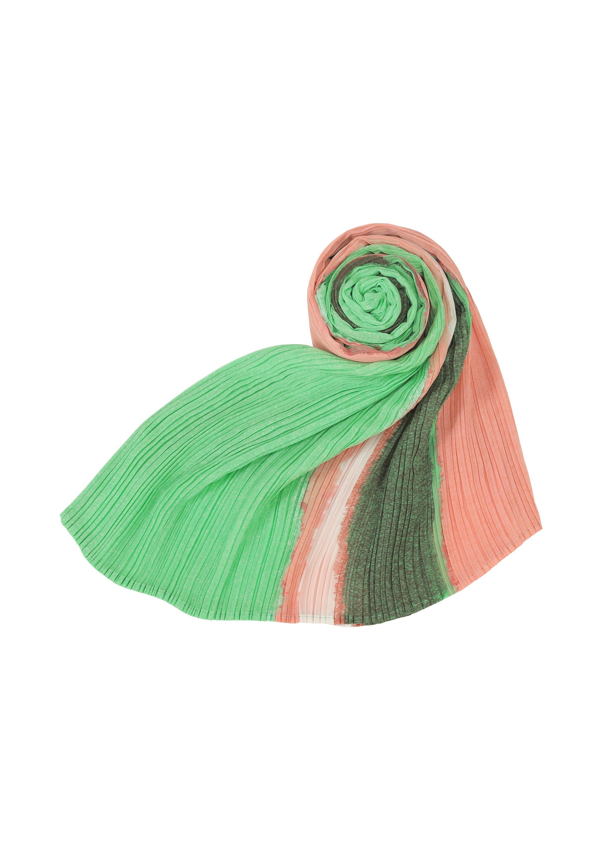 This large pleated stole features a pattern that uses stencil printing to express a cut-and-pasted pattern of colored paper while preserving the graininess of the colors and misalignment of the print. It has a hole in the center that you can put your head through.
