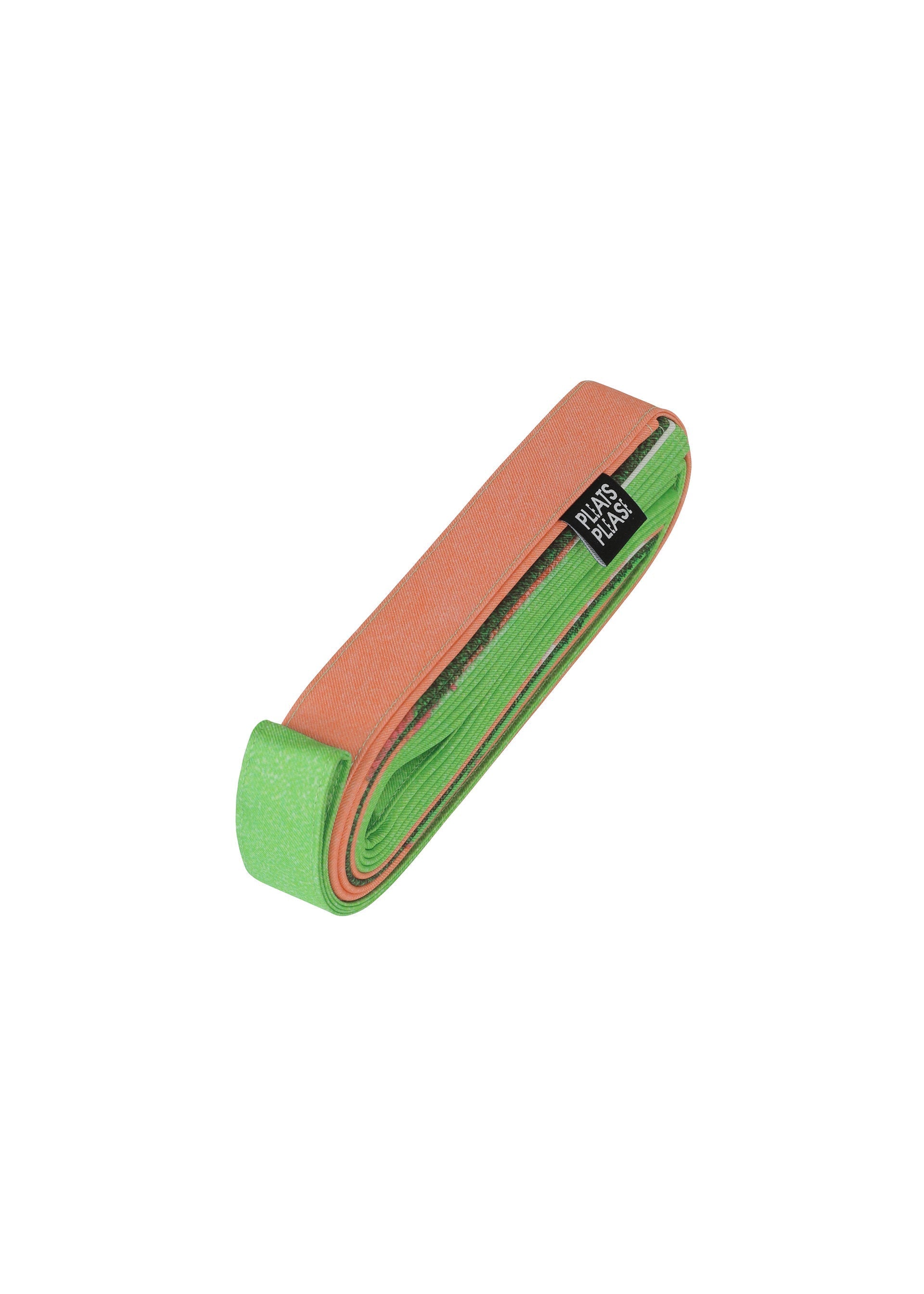 This tote bag is made from bonded recycled polyester fabric with accordion pleats. It can be folded along the pleats lines. It can be carried even more compactly when the handles are wrapped.