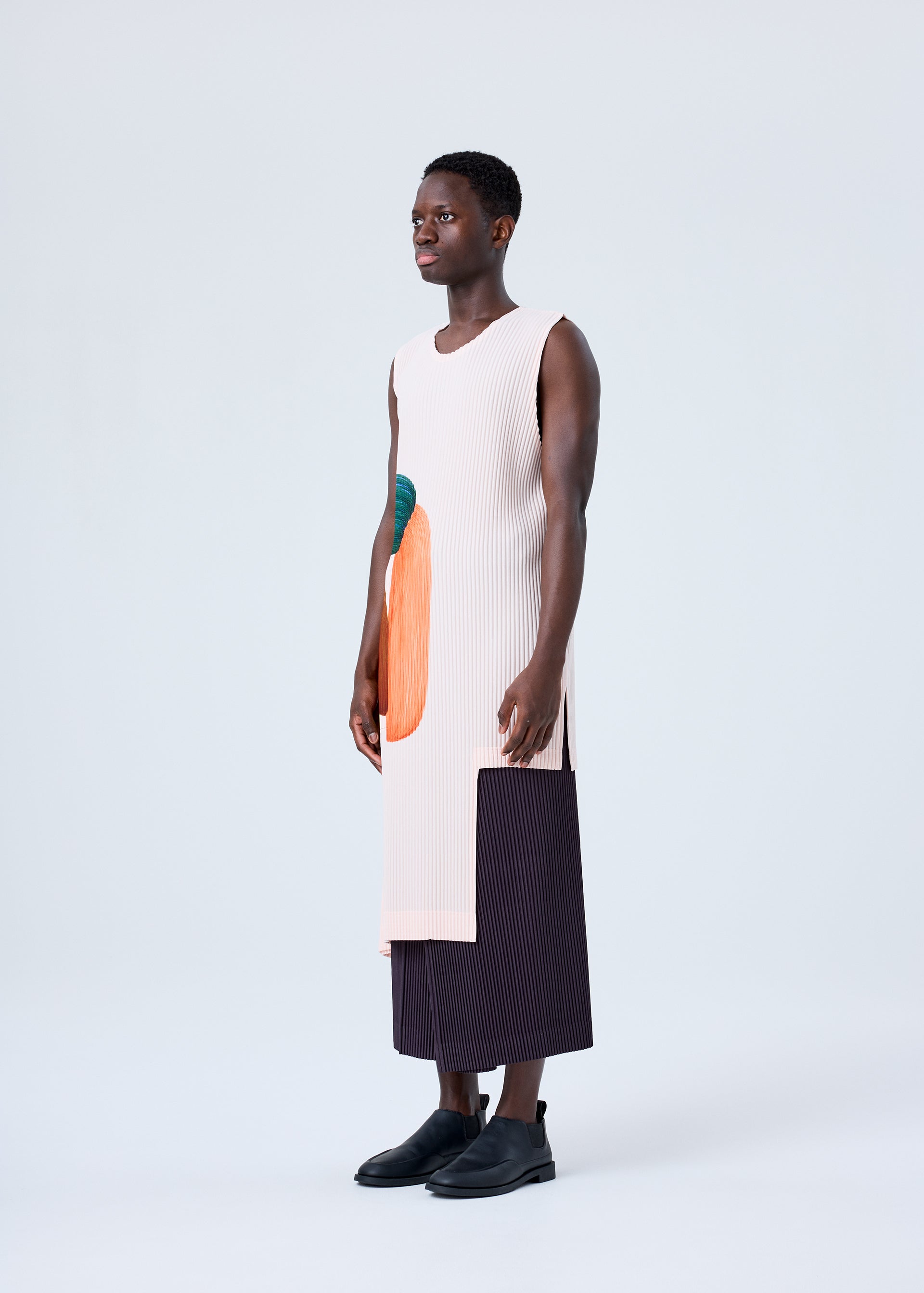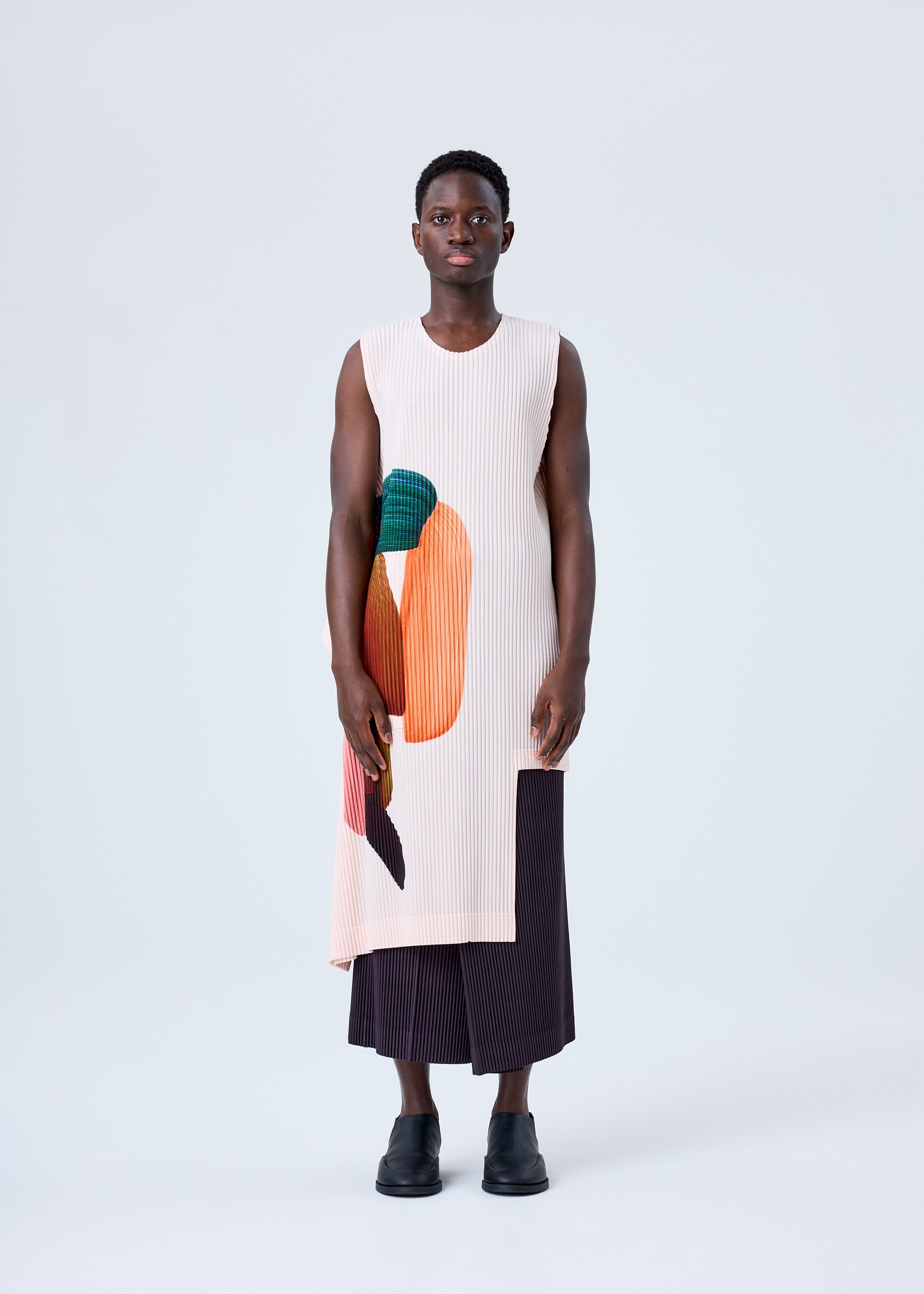 This round-neck, sleeveless top follows the ratio of blank space to pattern in designer/artist Ronan Bouroullec's drawings, and is characterized by its design that looks like the clothing details have been incorporated into the extension of a picture frame. It is printed on a soft, gentle fabric color that enhances the pattern. There is a slit on the left side. There is a pocket on the right side and a slit on the left side.