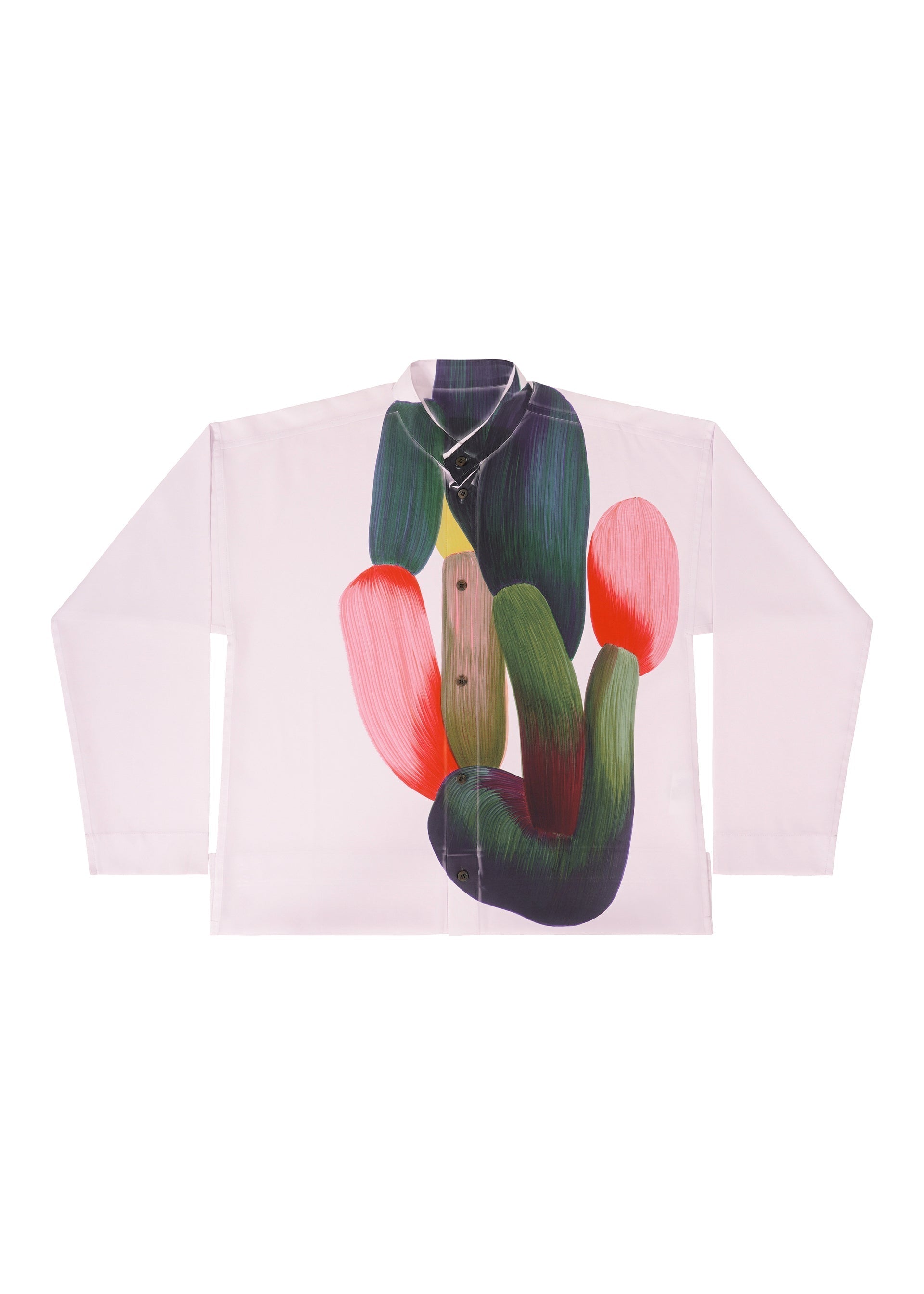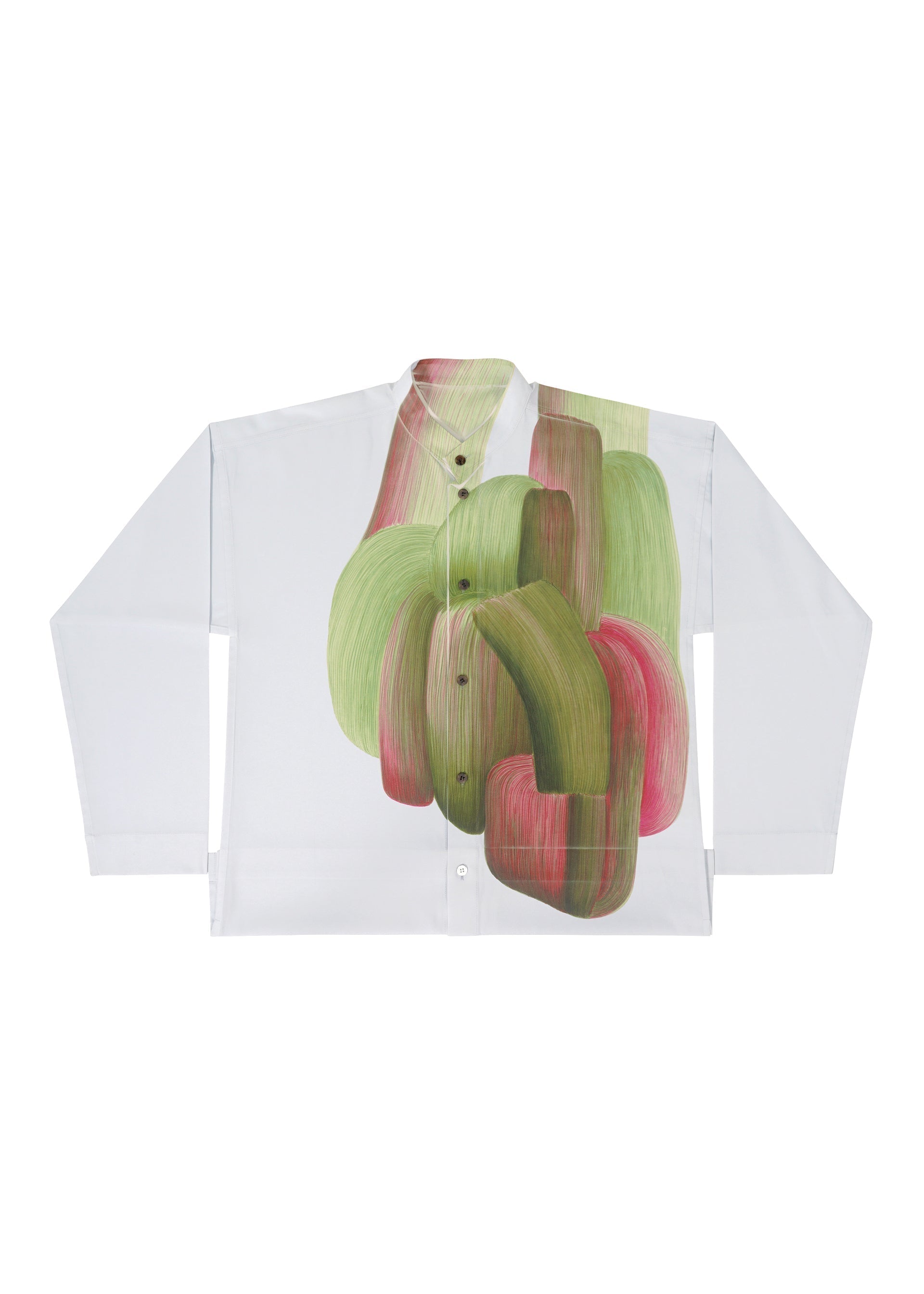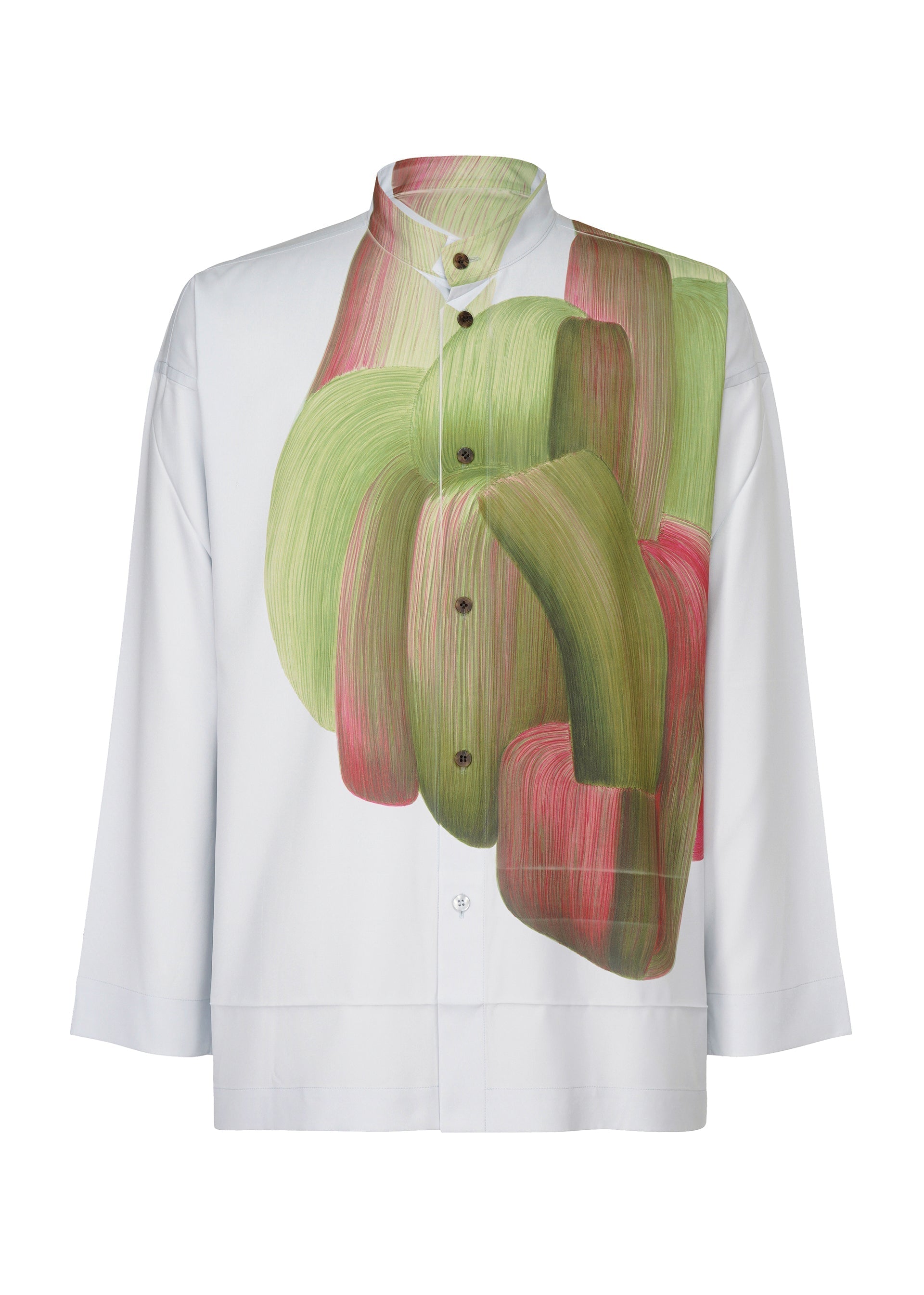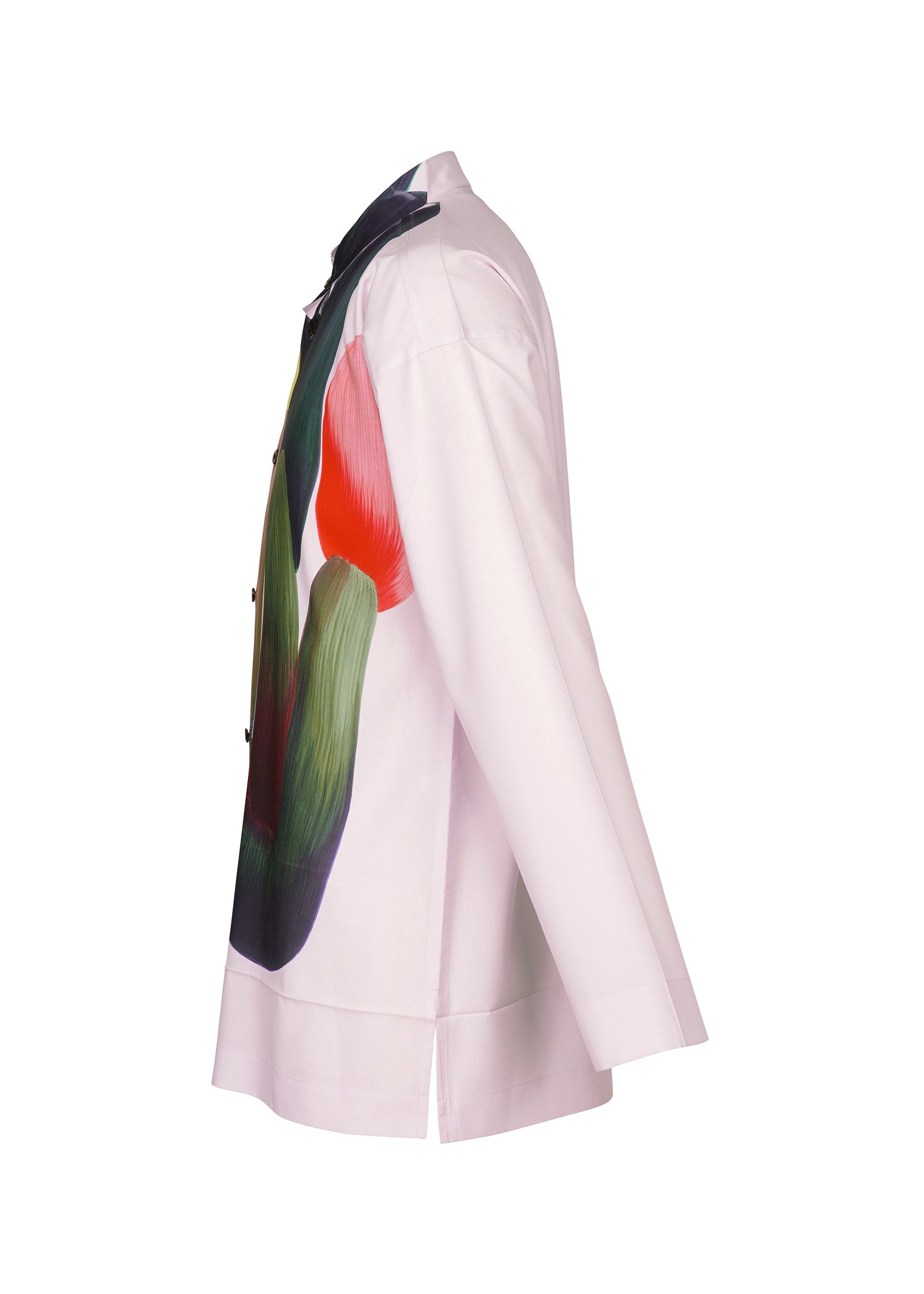This shirt with a standing collar has a transfer print featuring designer/artist Ronan Bouroullec's drawings. The sleeves and torso area are folded in a way that brings out the inherent impact of the pattern. There are slits on both sides.