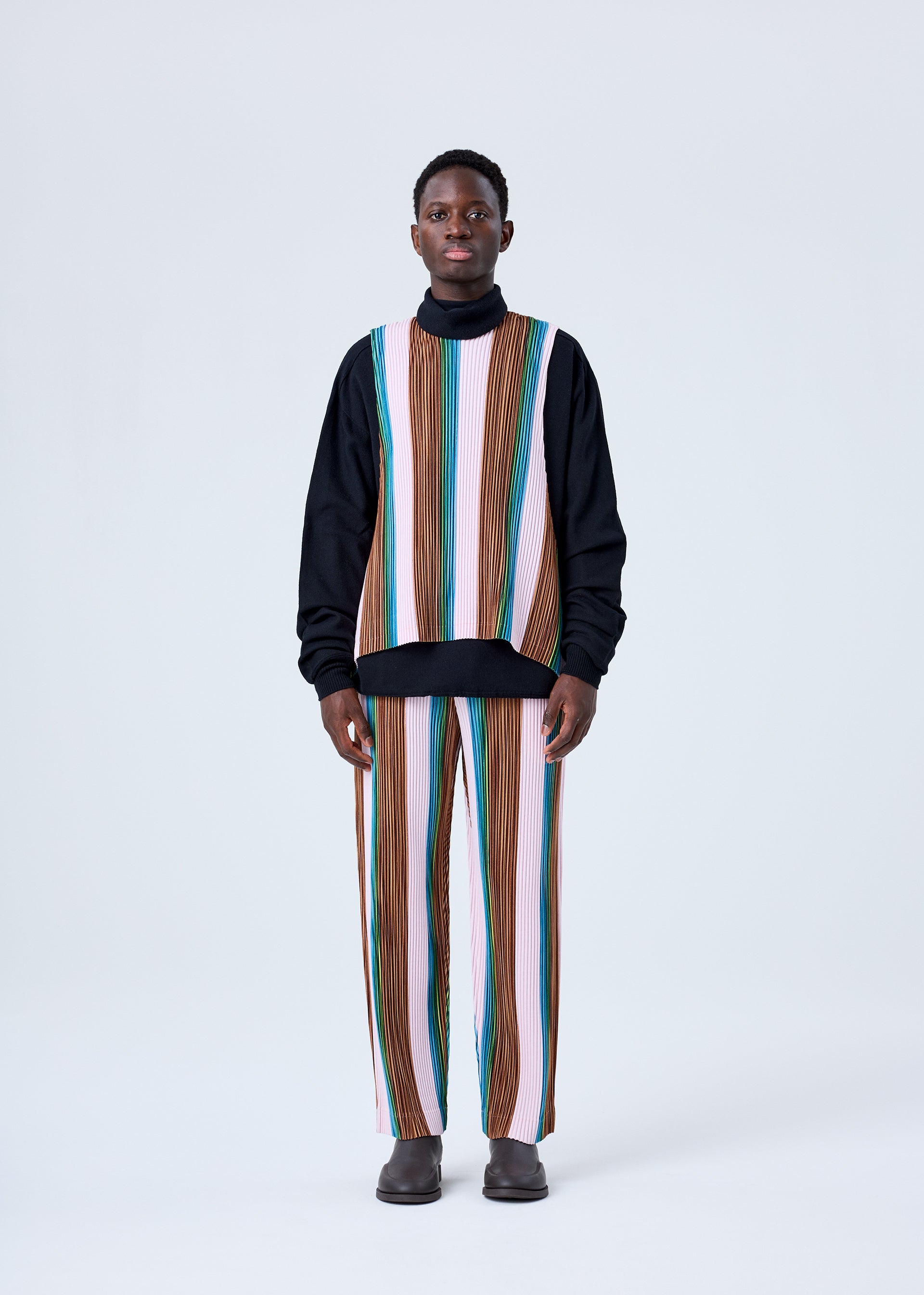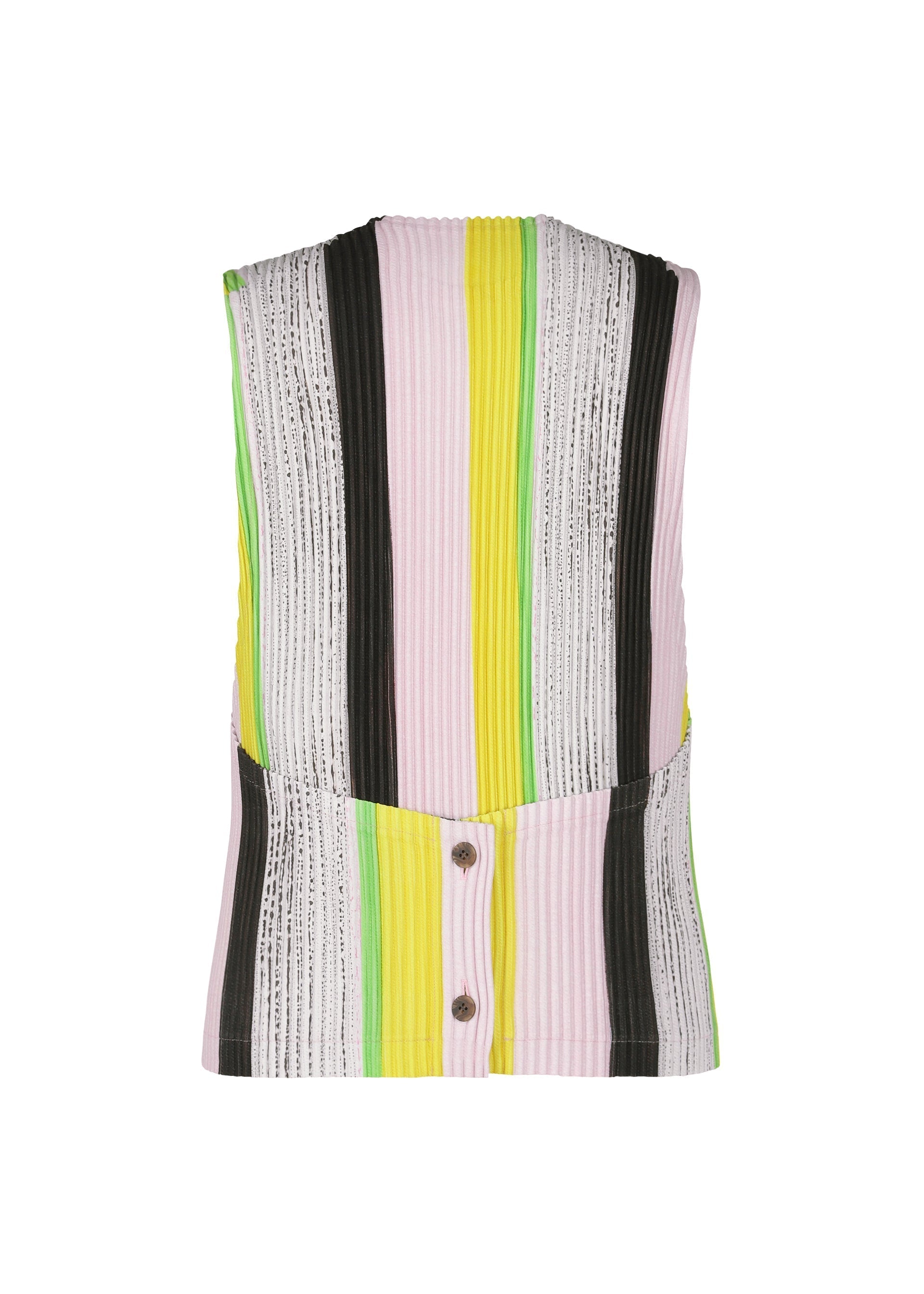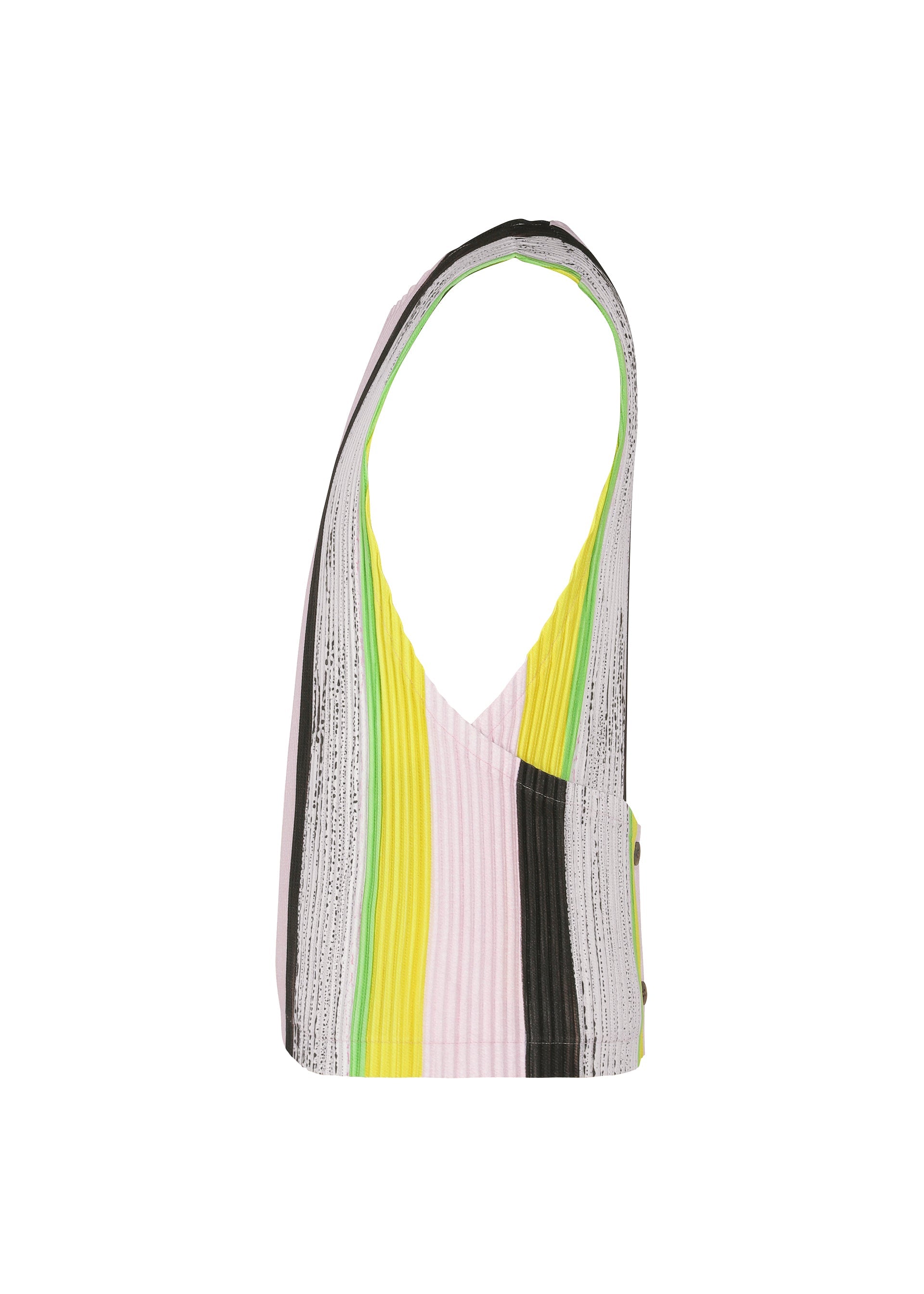 This round-neck vest has a striped print cut from part of a drawing by designer/artist Ronan Bouroullec. The inkjet print on both sides of the kersey fabric gives this vest a wonderfully colorful finish. You can enjoy it as an item with a presence.