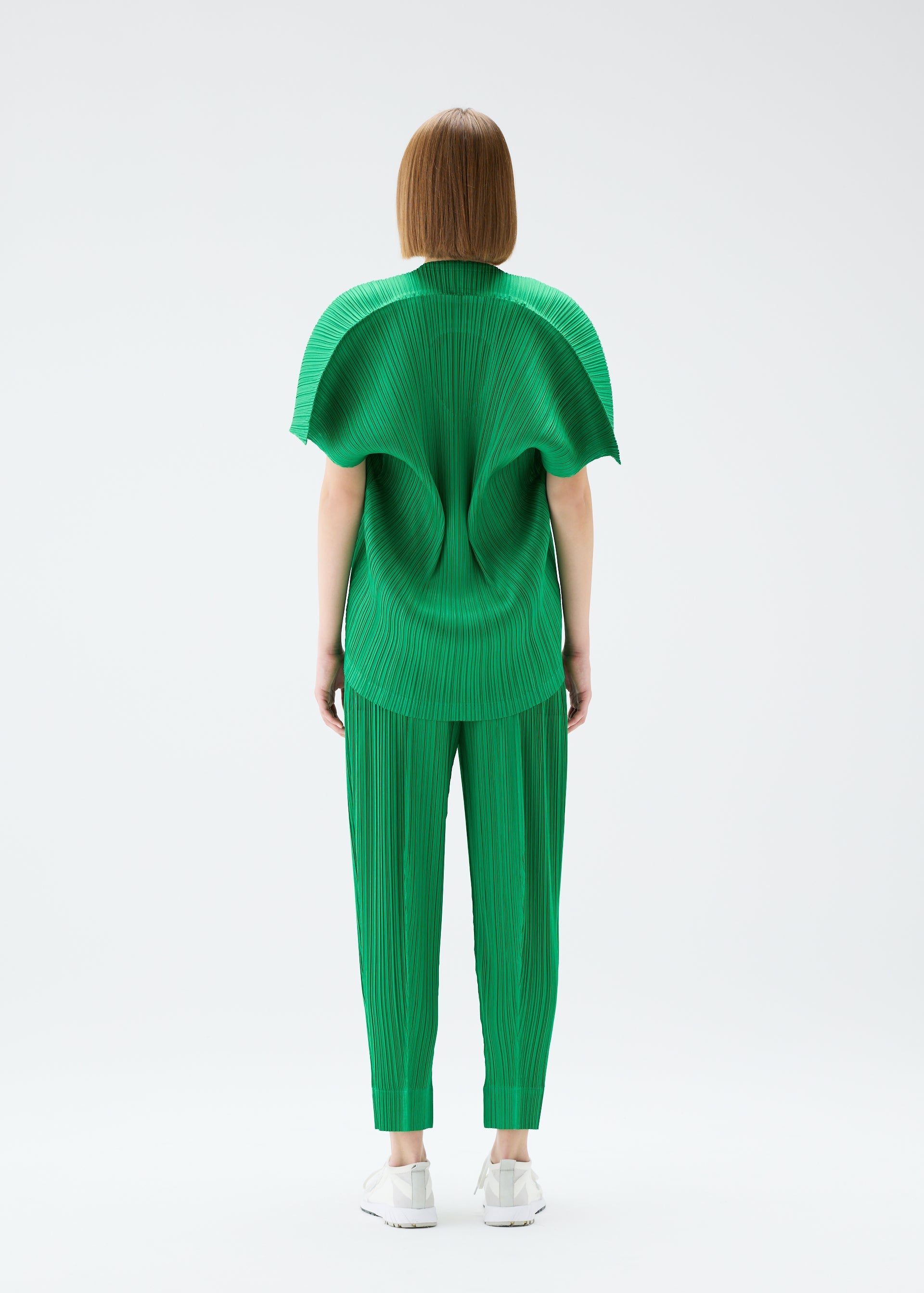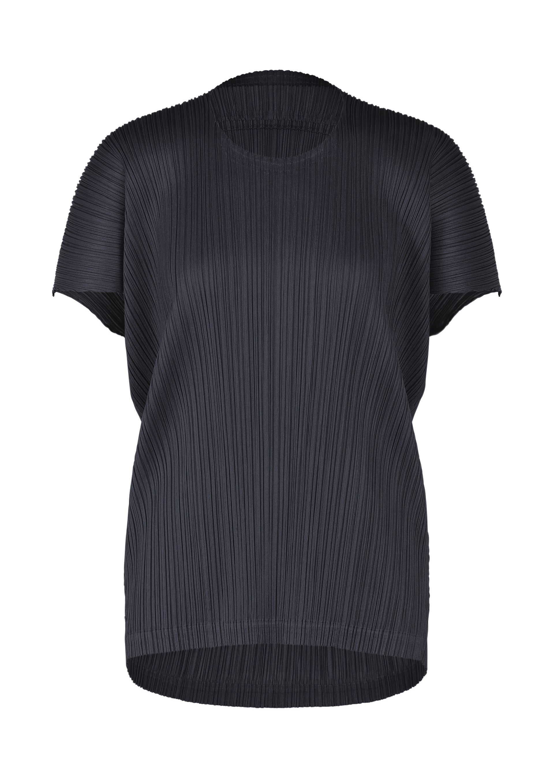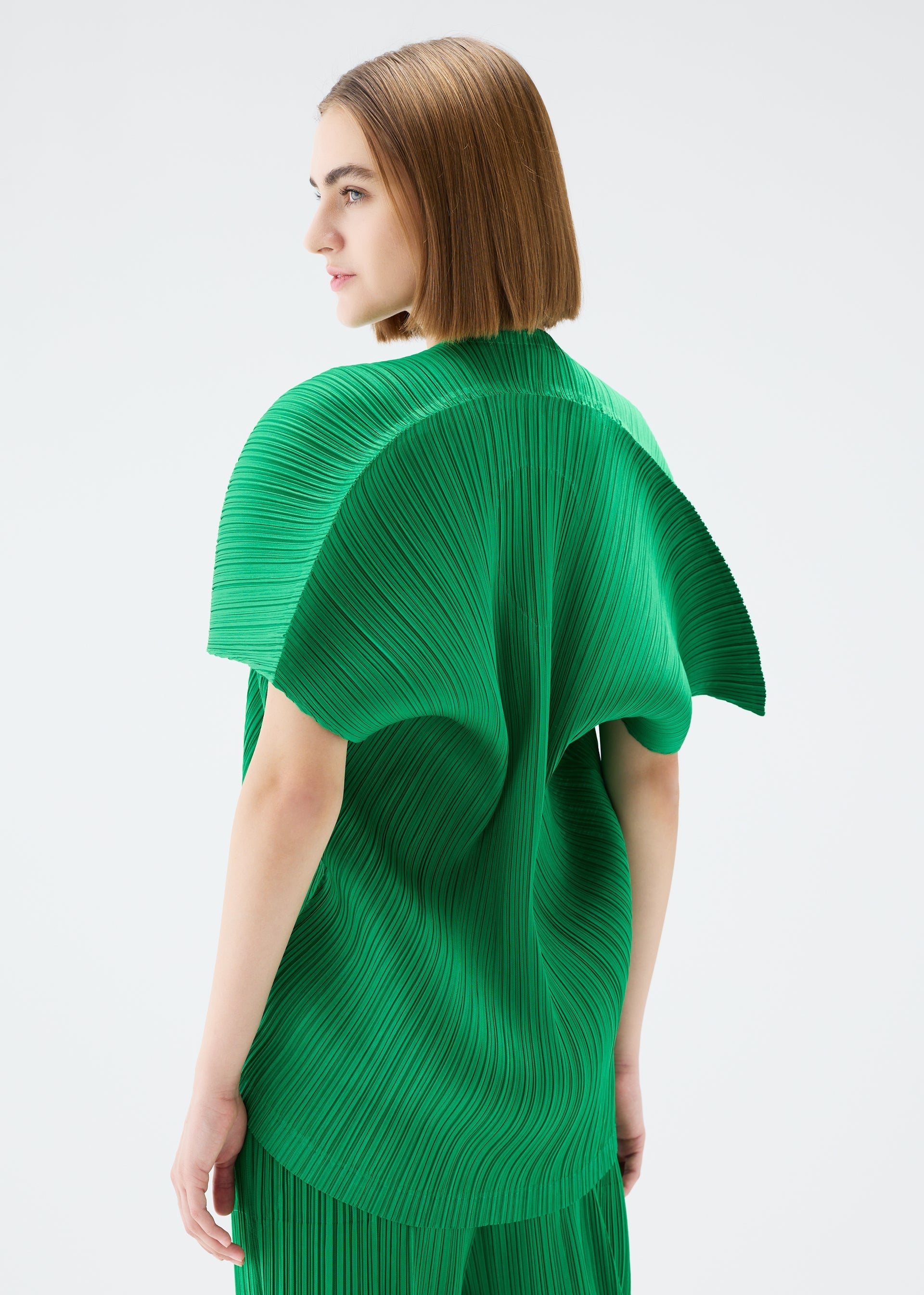 This series features relaxed silhouettes inspired by minerals from an unknown planet. The items feature square shapes that resemble mineral forms when the garments are laid flat. This pleated top has a relaxed, draped fit, round neck, and flared short sleeves.