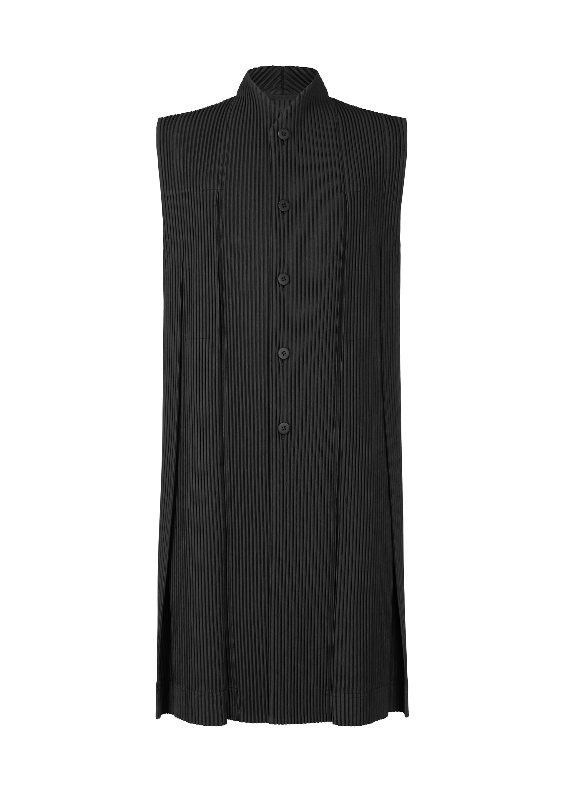 This long pleated vest has a straight fit, high collar, and button down closure.